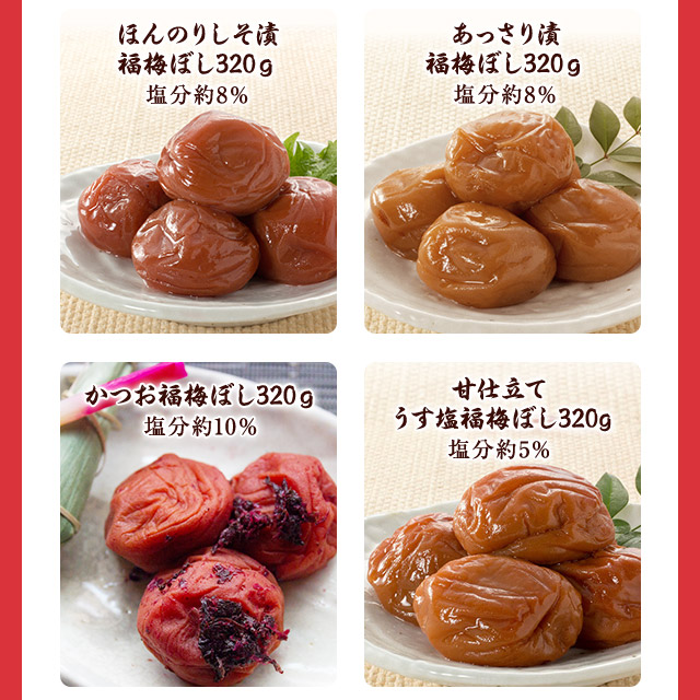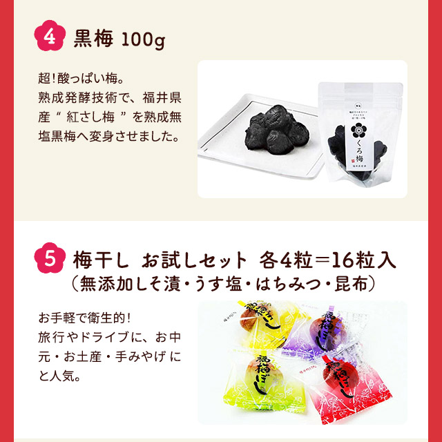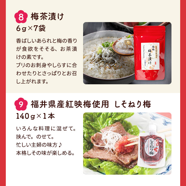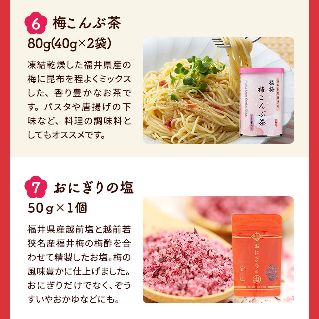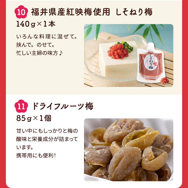 ●選べる梅干し 〇うす塩 原材料:梅、漬け原材料[食塩、還元水飴、砂糖、発酵調味料]/調味料(アミノ酸等:大豆由来)、酸味料、ユッカ抽出物、 ビタミンB1 内容量:320g 賞味期限:約180日 保存方法:直射日光・高温多湿を避け保存 ※開封後要冷蔵 〇しそ漬 原材料:梅、漬け原材料[食塩、しそ] 内容量:320g 賞味期限:約180日 保存方法:直射日光・高温多湿を避け保存 ※開封後要冷蔵 〇はちみつ 原材料:梅、漬け原材料[果糖ぶどう糖液糖、食塩、発酵調味料、はちみつ]/酸味料(アミノ酸等:小麦由来)、酸味料、ユッカ抽出物、ビタミンB1、甘味料(ステビア) 内容量:260g 賞味期限:約180日 保存方法:直射日光・高温多湿を避け保存 ※開封後要冷蔵 〇こんぶ 原材料:梅、漬け原材料[還元水飴、砂糖、食塩、発酵調味料、こんぶエキス]/調味料(アミノ酸等:大豆由来)、酸味料、ユッカ抽出物、 ビタミンB1 内容量:260g 賞味期限:約180日 保存方法:直射日光・高温多湿を避け保存 ※開封後要冷蔵 〇かつお 原材料:梅、漬け原材料[食塩、還元水飴、砂糖、発酵調味料、しそ、かつお削りぶし]/調味料(アミノ酸等)(乳成分・大豆由来)、酸味料、ユッカ抽出物、ビタミンB1、甘味料(ステビア)、野菜色素 内容量:320g 賞味期限:約120日 保存方法:直射日光・高温多湿を避け保存 ※開封後要冷蔵 〇ほんのりしそ漬 原材料:梅、漬け原材料[還元水飴、食塩、しそ]、酸味料、ユッカ抽出物、野菜色素、ビタミンB1 内容量:320g 賞味期限:約180日 保存方法:直射日光・高温多湿を避け保存 ※開封後要冷蔵 〇あっさり漬 原材料:梅、漬け原材料[還元水飴、食塩、砂糖、発酵調味料]/調味料(アミノ酸等)(大豆由来)、酸味料、ユッカ抽出物、ビタミンB1 内容量:320g 賞味期限:約180日 保存方法:直射日光・高温多湿を避け保存 ※開封後要冷蔵 〇甘仕立てうす塩味 原材料:梅、漬け原材料[還元水飴、食塩、醸造酢、発酵調味料]/酸味料、酒精、調味料(アミノ酸等)(大豆由来)、甘味料(ステビア)、ビタミンB1 内容量:320g 賞味期限:約180日 保存方法:直射日光・高温多湿を避け保存 ※開封後要冷蔵 ●梅はるさめスープ 原材料:【はるさめブロック】馬鈴薯でん粉(中国産)緑豆でん粉(中国産)【梅スープ】糖類(ぶどう糖(国内製造)、砂糖)食塩、梅肉パウダー、オニオンパウダー、顆粒ラード、粉末醤油、チキンエキス調味料、ガーリックパウダー、コラーゲンペプチド、コショー、たん白加水分解物/調味料(アミノ酸等)カラメル色素、香料、(一部に乳成分・小麦・大豆・豚肉・鶏肉・ゼラチンを含む) 内容量:はるさめブロック(10gx4袋)・梅スープ(5gx4包)を2袋 賞味期限:製造より2年 保存方法:直射日光や高温多湿を避けて保存してください。 ●梅の実ごろごろひじきごはん 原材料:かりかり梅、ひじき、食塩、砂糖、果糖ブドウ糖液糖、ごま、米発酵調味料、醸造酢、しそ梅酢、たん白加水分解物、酵母エキス、ホタテエキス、昆布粉末、香辛料/酒精、酸味料、調味料(アミノ酸等)、しそ香料、ビタミンB1、着色料(赤102号)、(一部にごまを含む) 内容量:40g 賞味期限:常温6ヶ月 保存方法:直射日光・高温多湿を避け、冷暗所で保存して下さい。 ●黒梅 原材料:梅 内容量:100g 賞味期限:製造より300日 保存方法:直射日光、高温多湿を避け、常温で保存してください。 ●梅干しお試しセット 原材料:〇うす塩:梅、漬け原材料[食塩、還元水飴、砂糖、発酵調味料]/調味料(アミノ酸等:大豆由来)、酸味料、ユッカ抽出物、 ビタミンB1 〇しそ漬:梅、漬け原材料[食塩、しそ] 〇はちみつ:梅、漬け原材料[果糖ぶどう糖液糖、食塩、発酵調味料、はちみつ]/酸味料(アミノ酸等:小麦由来)、酸味料、ユッカ抽出物、ビタミンB1、甘味料(ステビア) 〇こんぶ:梅、漬け原材料[還元水飴、砂糖、食塩、発酵調味料、こんぶエキス]/調味料(アミノ酸等:大豆由来)、酸味料、ユッカ抽出物、 ビタミンB1 内容量:16個 賞味期限:約180日 保存方法:直射日光、高温多湿を避け保存 ※開封後要冷蔵 ●梅こんぶ茶 原材料:食塩、砂糖、梅肉(梅(福井県産))、澱粉分解物、しそ、昆布/調味料(アミノ酸等)、酸味料、香料 内容量:80g(40g×2袋) 賞味期限:製造日から2年 保存方法:直射日光、高温多湿を避けて常温で保存 ●梅茶漬け 原材料:食塩、砂糖、粉末醤油(醤油、デキストリン)、梅肉(梅(福井県産))、澱粉分解物、もち米、碾茶、かつおエキス、煮干エキス、昆布粉末、しそ、かつお粉末、抹茶/調味料(アミノ酸等)、酸味料、香料、(一部に小麦、大豆を含む) 内容量:42g(6g×7袋) 賞味期限:製造日から2年 保存方法:直射日光、高温多湿を避けて常温で保存 ●しそねり梅しそ葉入り 原材料:梅、しそ、食塩 内容量:140g 賞味期限:約180日 保存方法:直射日光、高温多湿を避け保存 ※開封後要冷蔵 ●しそねり梅 原材料:梅、食塩、しそ 内容量:140g 賞味期限:約180日 保存方法:直射日光・高温多湿を避け保存 ※開封後要冷蔵 ●ドライフルーツ梅 原材料:梅、砂糖/トレハロース、酸味料、ビタミンC 内容量:85g 賞味期限:約1年 保存方法:直射日光・高温多湿を避け保存 ※開封後要冷蔵 