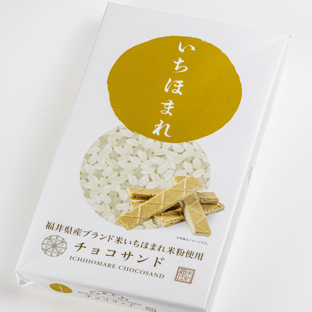 商品説明: 福井のブランド「いちほまれ」の米粉を使用したチョコサンドです。 ほのかなお米の香りとサクサク感で手がとまらない逸品です。