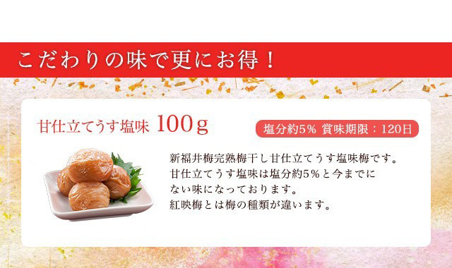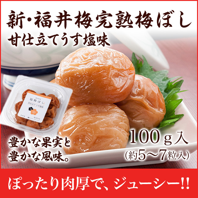 商品説明: 福梅ぼしから新ブランド登場!新・福井梅完熟梅ぼし甘仕立てうす塩味新発売!